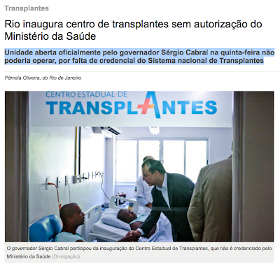Governo Sérgio Cabral inaugura um Centro Estadual de Transplantes no Hospital São Francisco de Assis SEM autorização do Ministério da Saúde, ilegal e criminoso e daí ?